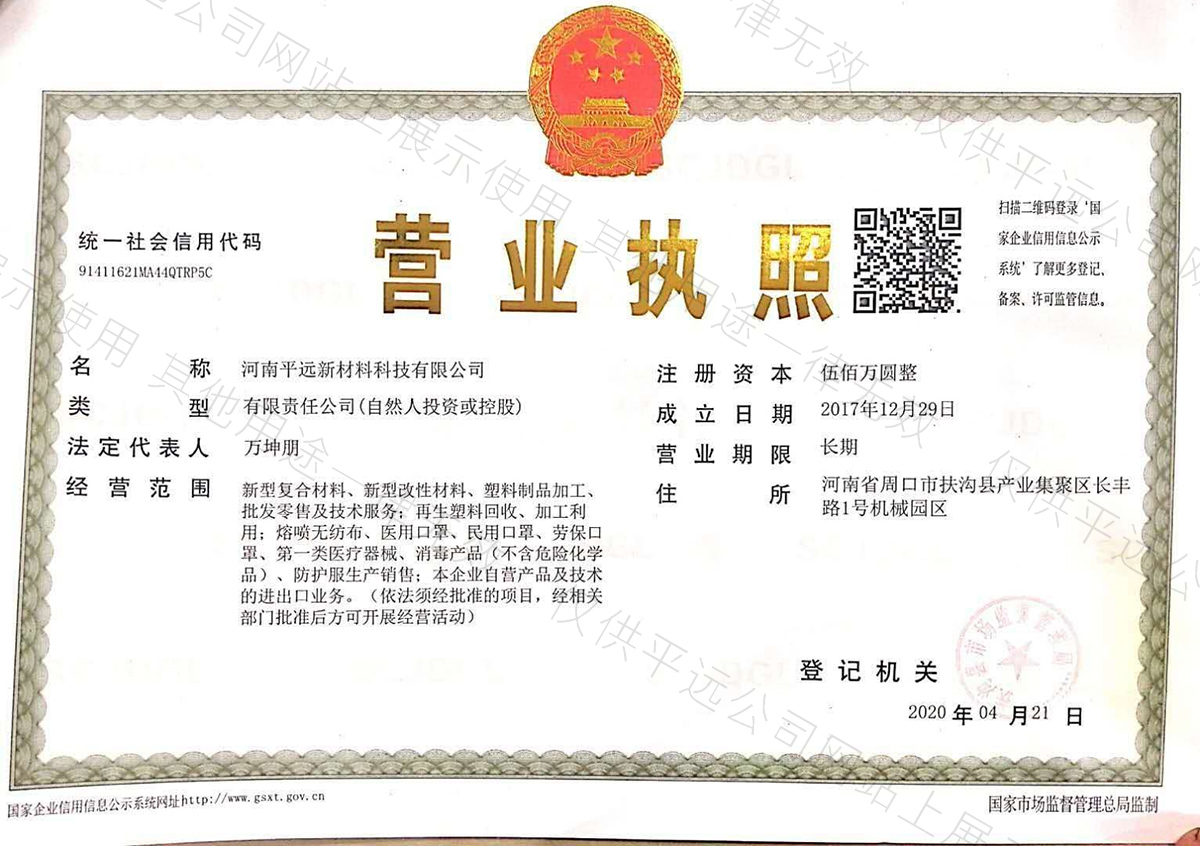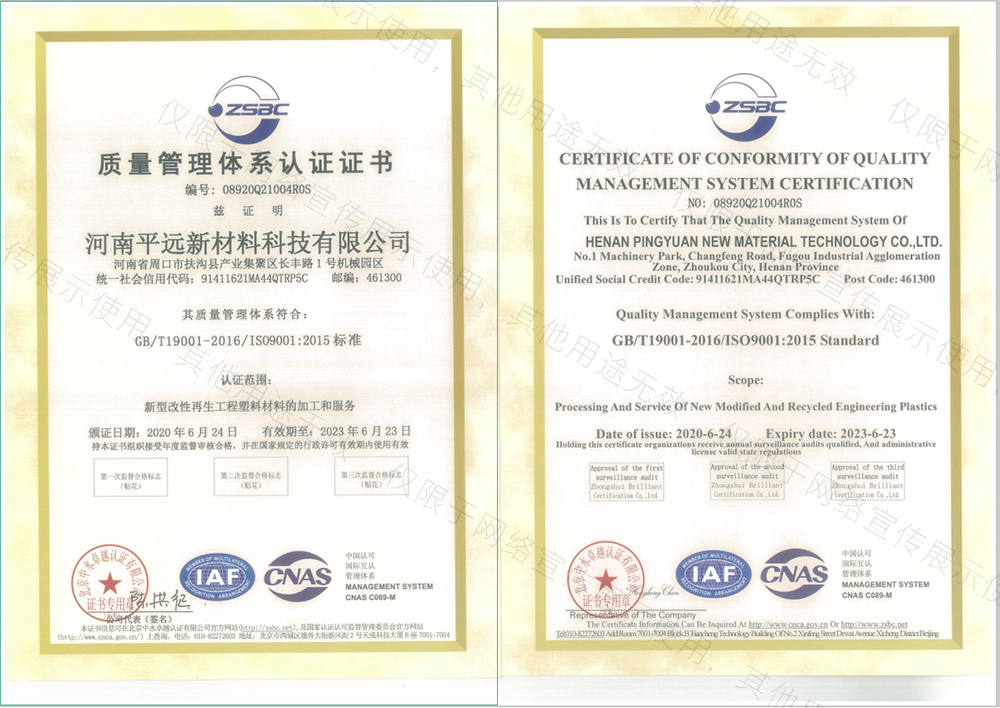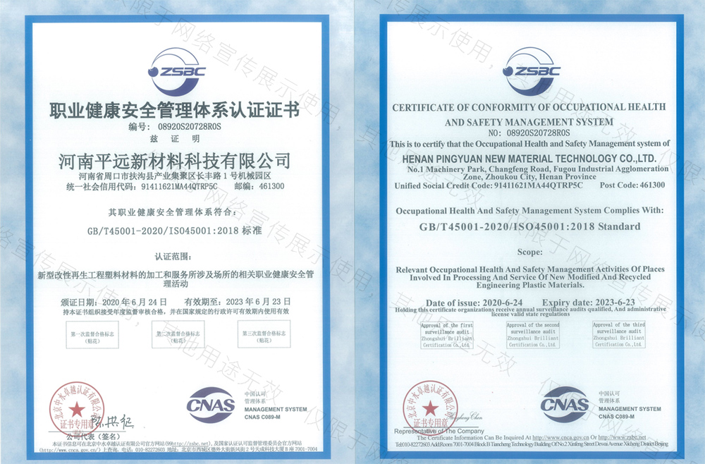 河南平遠(yuǎn)新材料科技有限公司生產(chǎn)基地坐落于河南省鄢陵縣先進(jìn)制造業(yè)開(kāi)發(fā)區(qū),工廠占地10000平方米。公司通過(guò)GRS全球回收標(biāo)準(zhǔn)認(rèn)證、ISO9001質(zhì)量體系、14001環(huán)境體系和45001職業(yè)健康安全管理體認(rèn)證。華東分公司位于浙江省余姚市中國(guó)塑料城。